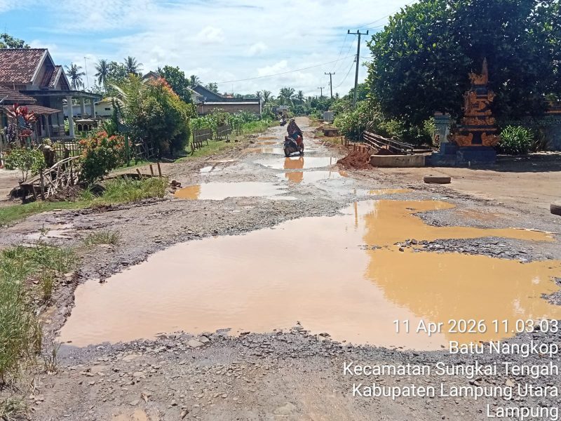 Jalan kabupaten yang menjadi urat nadi penghubung Desa Mekar Asri, Desa Batu Nangkep, Desa Galih Rejo, hingga Desa Negeri Campang Jaya, Kecamatan Sungkai Tengah, Kabupaten Lampung Utara menuju Blambangan Umpu, Kabupaten Way Kanan, kini tak ubahnya seperti kubangan maut.