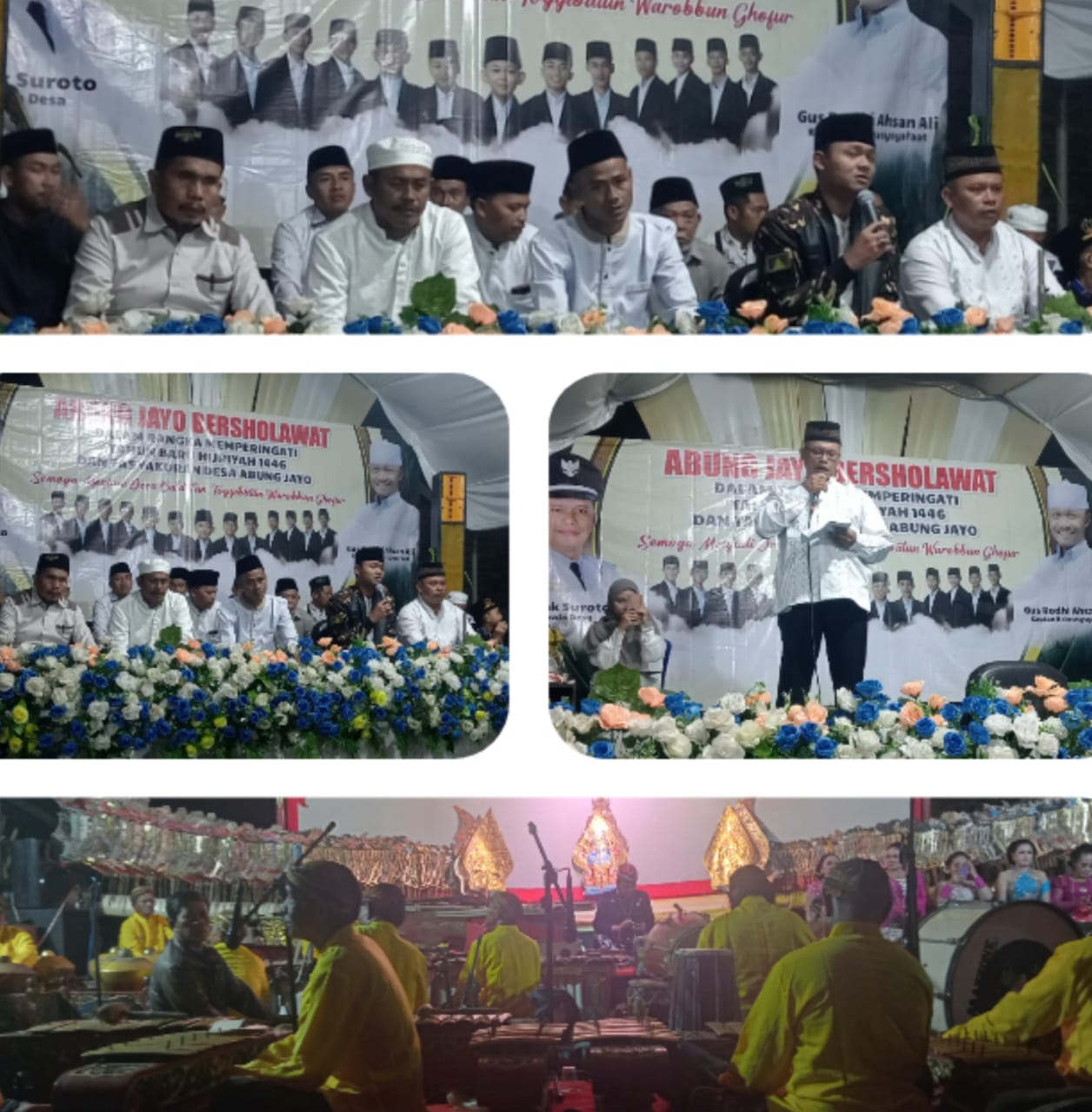 Acara pengajian dan sholawat berlangsung dengan hidmad, Gus Rodhi Ahsan Ali memimpin sholawat. antusias warga tumpah ruah, terlihat memadati lapangan perempatan Abung Jayo untuk mengikuti acara sholawat tersebut. seusai acara sholawat bersama Pemdes Abung Jayo menampilkan hiburan music wayang kulit untuk pengunjung yang hadir.