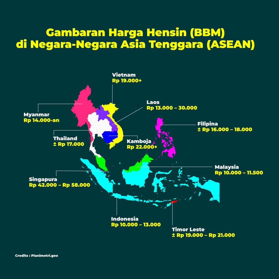 Negara seperti Laos, Filipina, Myanmar, dan Kamboja mencatat harga BBM di kisaran Rp26.000 hingga Rp33.000 per liter.