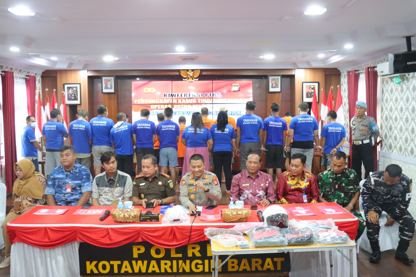 Polres Kotawaringin Barat (Kobar) menggelar kegiatan press confrence terkait pengungkapan tindak pidana peredaran gelap narkotika di wilayah Kabupaten Kobar, Jumat (2/8/2024) pagi di Aula Satya Haprabu Polres Kobar.