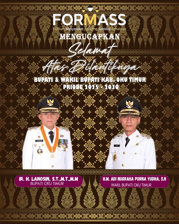 Dalam Kesempatan ini Seluruh Pengurus FORum MAsyrakat Pejuang Sebiduk Sehaluan (FORMASS) Baik pengurus Kabupaten,pengurus 20 Kecamatan dan pengurus tingkat desa se Kabupaten OKU Timur,Melalui Ketua FORMASS Kab.OKU Timur Mengucapkan Selamat Kepada
