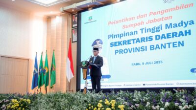 Gubernur Banten Andra Soni melantik dan memimpin pengambilan sumpah Jabatan Pimpinan Tinggi Madya Sekretaris Daerah (Sekda) Provinsi Banten Deden Apriandhi Hartawan di Pendopo Gubernur Banten, KP3B, Kota Serang, Rabu (9/7/2025). Pelantikan berdasarkan Keputusan Presiden Republik Indonesia Prabowo Subianto Nomor 104/TPA Tahun 2025.