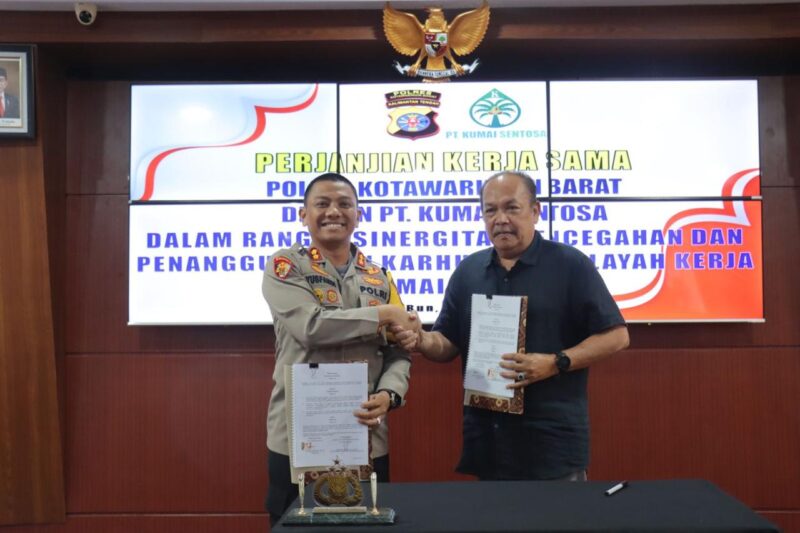 Kapolres Kotawaringin Barat (Kobar) AKBP Yusfandi Usman, S.I.K., M.I.K., menandatangani nota kesepahaman (memorandum of understanding atau MoU) dengan PT. Kumai Sentosa di Aula Satya Haprabu Polres Kobar, Senin (26/8/2024) pagi.