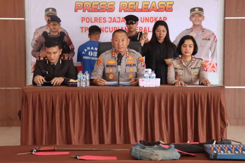 Kapolres Lamandau Akbp Bronto Budiyono S.I.K Pimpin Press Release Pengungkapan Kasus Dugaan Tindak Pidana Pencurian di mesjid Wilayah Hukum Polres lamandau, Sabtu (3/07/2024).