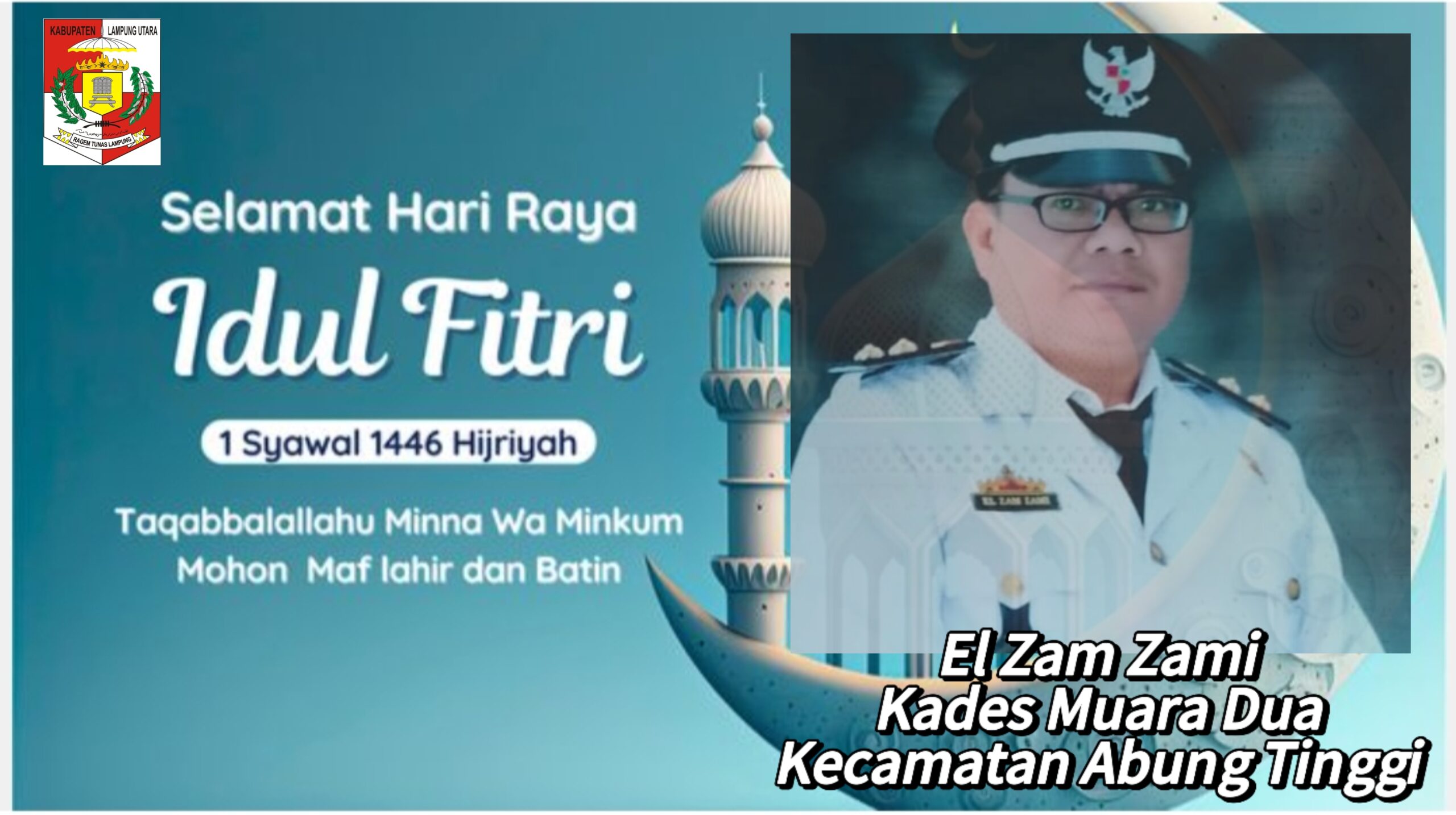 Kepala Desa Muara Dua Kecamatan Abung Tinggi Kabupaten Lampung Utara El Zam Zami mengucapkan, Selamat Hari Raya Idul Fitri 1446 Hijriah bagi umat muslim di Indonesia, hari Raya Idul Fitri adalah hari yang dinanti-nantikan dan dirindukan dan hari kemenangan bagi umat muslim.