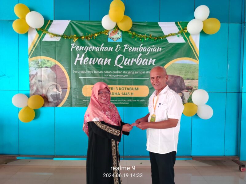 Kepala SMKN 3 Kotabumi beserta dewan guru melaksanakan pemotongan hewan kurban sebanyak tiga ekor sapi, dan dibagikan kepada siswa-siswi SMK serta kepada masyarakat yang ada dilingkungan setempat, Rabu (19/6/2024).