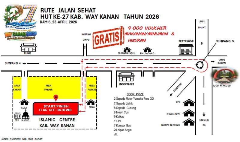 Dalam rangka memperingati Hari Ulang Tahun (HUT) ke-27, Pemerintah Kabupaten Way Kanan akan menggelar kegiatan Jalan Sehat massal pada Kamis, 23 April 2026. Mengusung tema “Sinkronisasi & Kolaborasi Pembangunan”, kegiatan ini menjadi momentum kebersamaan sekaligus ajakan hidup sehat bagi seluruh masyarakat.