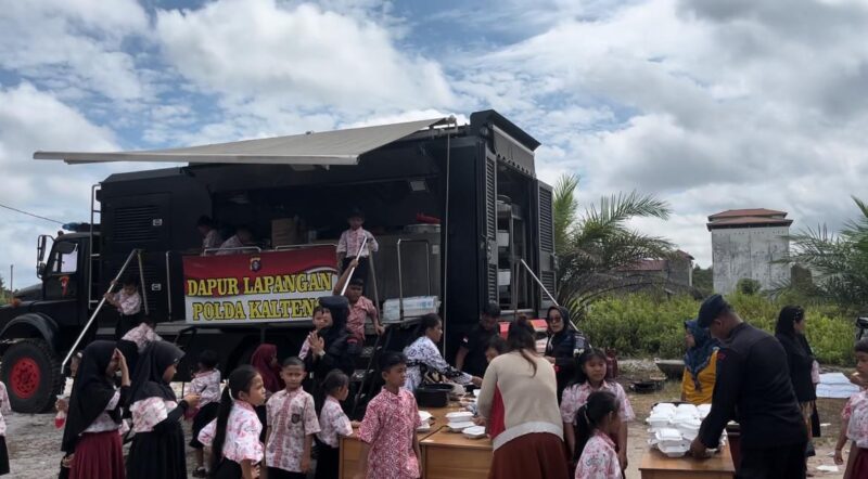 Wujud Bhakti Polri, Brimob Polda Kalteng Menyiapkan Makanan Bergizi Untuk Siswa dan Siswi di Lapangan SDN 4 Tangkiling